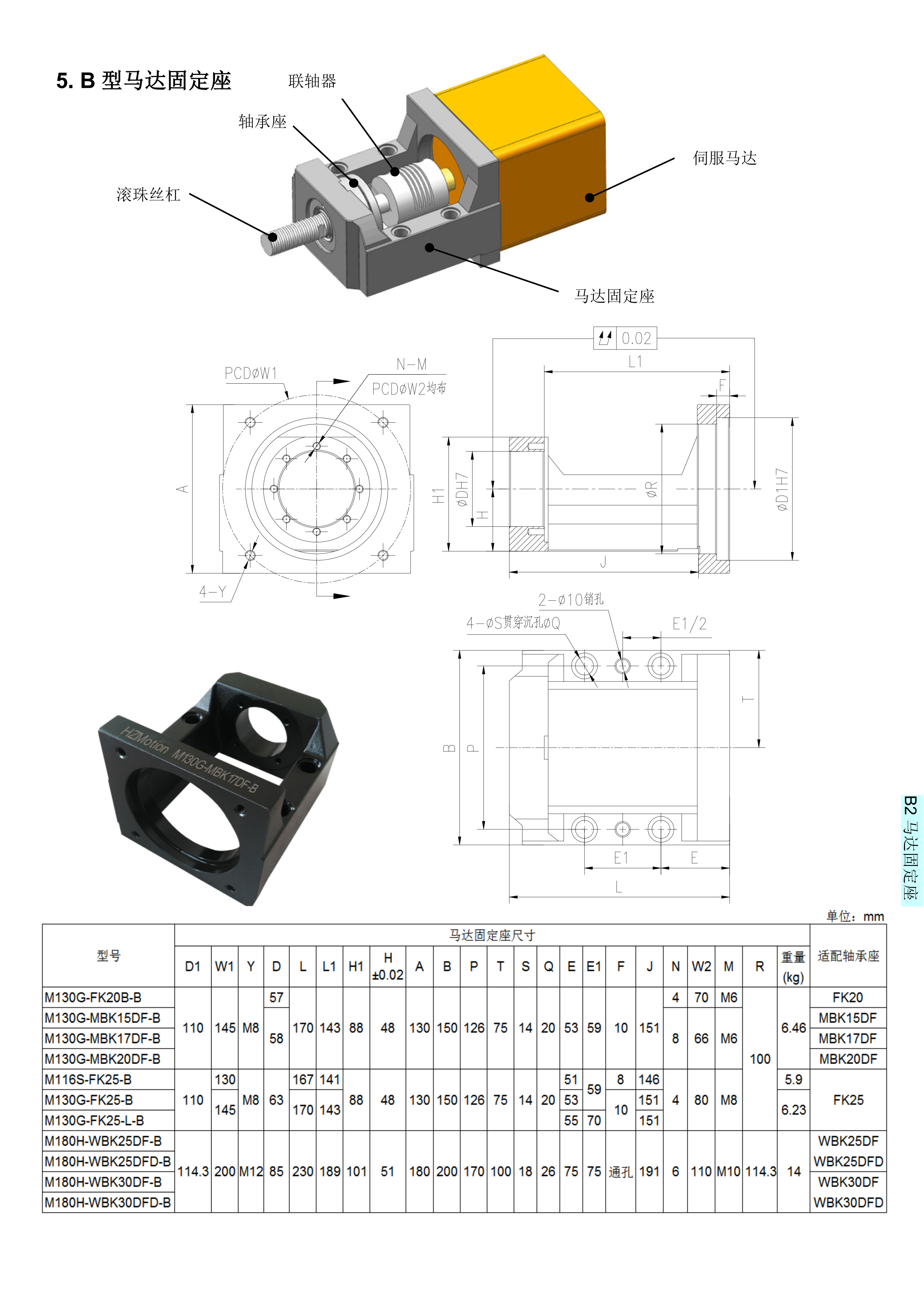公司研發和生產的馬達固定座,馬達端可適應松下,三菱,臺達,東方等著名廠商的伺服馬達/步進馬達,軸承座一端適用國際標準化軸承座,從而,馬達安裝與滾珠絲杠可保證同心,提高安裝效率與安裝質量。A型,B型,C型,H型,L型與臺灣嵩陽SYK相應型號通用;KK型等同臺灣上銀KK系列,PMI之KM系列,日本THK之KR/SKR等線性模的固定端。B型馬達座具體型號:M130G-FK20B-B、M130G-MBK15DF-B、M130G-MBK17DF-B、M130G-MBK20DF-B、M116S-FK25-B、M130G-FK25-B、M130G-FK25-L-B、M180H-WBK25DF-B、M180H-WBK25DFD-B、M180H-WBK30DF-B、M180H-WBK30DFD-B。