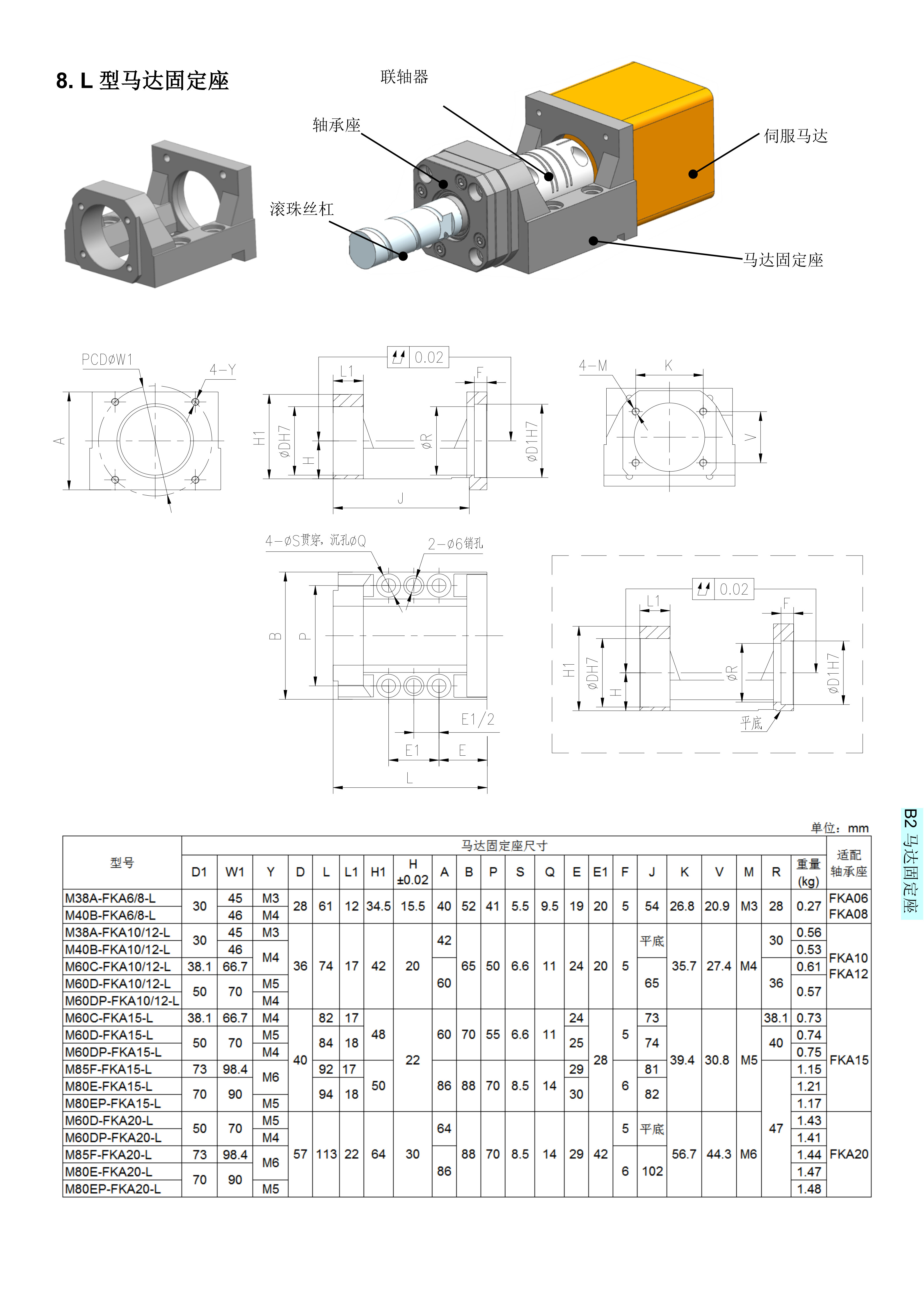 公司研發和生產的馬達固定座,馬達端可適應松下,三菱,臺達,東方等著名廠商的伺服馬達/步進馬達,軸承座一端適用國際標準化軸承座,從而,馬達安裝與滾珠絲杠可保證同心,提高安裝效率與安裝質量。A型,B型,C型,H型,L型與臺灣嵩陽SYK相應型號通用;KK型等同臺灣上銀KK系列,PMI之KM系列,日本THK之KR/SKR等線性模的固定端。L型馬達座具體型號:M38A-FKA6/8-L、M40B-FKA6/8-L、M38A-FKA10/12-L、M40B-FKA10/12-L、M60C-FKA10/12-L、M60D-FKA10/12-L、M60DP-FKA10/12-L、M60C-FKA15-L、M60D-FKA15-L、M60DP-FKA15-L、M85F-FKA15-L、M80E-FKA15-L、M80EP-FKA15-L、M60D-FKA20-L、M60DP-FKA20-L、M85F-FKA20-L、M80E-FKA20-L、M80EP-FKA20-L。