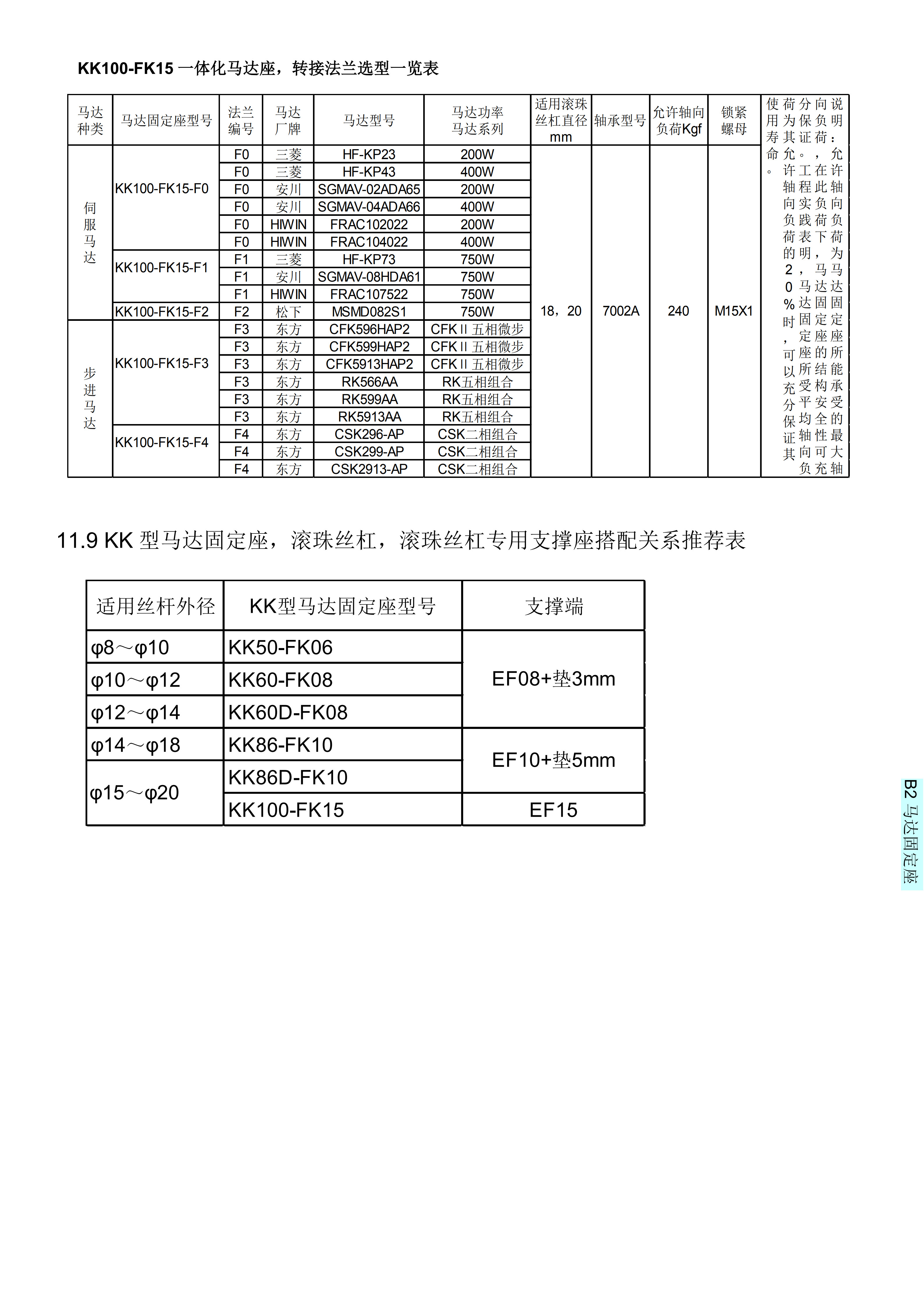公司研發和生產的馬達固定座,馬達端可適應松下,三菱,臺達,東方等著名廠商的伺服馬達/步進馬達,軸承座一端適用國際標準化軸承座,從而,馬達安裝與滾珠絲杠可保證同心,提高安裝效率與安裝質量。A型,B型,C型,H型,L型與臺灣嵩陽SYK相應型號通用;KK型等同臺灣上銀KK系列,PMI之KM系列,日本THK之KR/SKR等線性模的固定端。KK100-FK15一體化馬達座具體型號:KK100-FK15-F0、KK100-FK15-F1、KK100-FK15-F2、KK100-FK15-F3、KK100-FK15-F4。